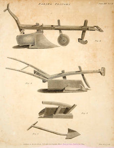 This is an original 1807 black and white copper engraving of a Paring-Plow (figs. 1 and 2), Paring Spade or Breast-Plow (fig. 3), and another farm implement that were used for paring and burning farmland during the early 19th century.