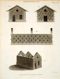 This is an original 1807 black and white copper engraving of exterior and interior schematics for Rammed Earth Buildings that were used throughout Europe.