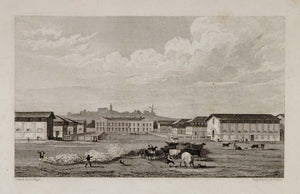 This is an original 1831 copper engraving of the Abattoir or slaughterhouse at Montmartre, Paris.