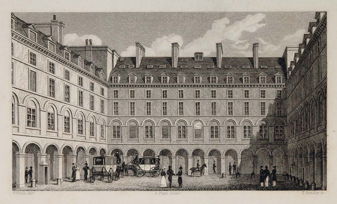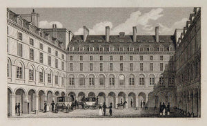 This is an original 1831 copper engraving of the Cour du Ministre des Finances, Paris.