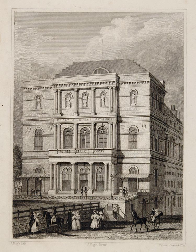 This is an original 1831 steel engraving of the Thމtre de l'Ambigu-Comique in Paris