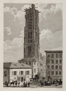 This is an original 1831 copper engraving of the Tour de Saint-Jacques-la-Boucherie in Paris. This Gothic tower is all that remains of the Church of St. Jacques.
