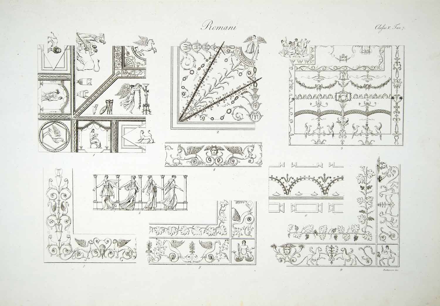 This is an original 1833 black and white copper engraving of arabesques from the city of Adria, arabesques from ancient Roman tombs, and arabesques from the Baths of Diocletian and the Baths of Titus in Rome, Italy.