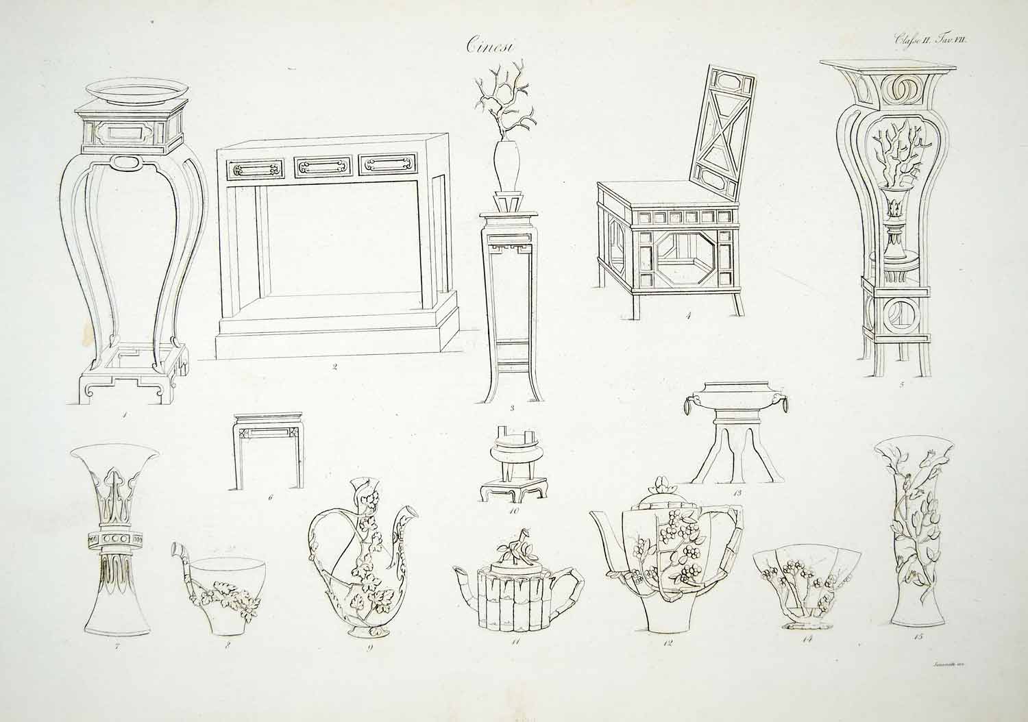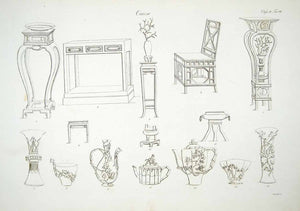 1833 Copper Engraving Art Chinese Furniture Table Chair Brazier Teapot Vase ILC1
