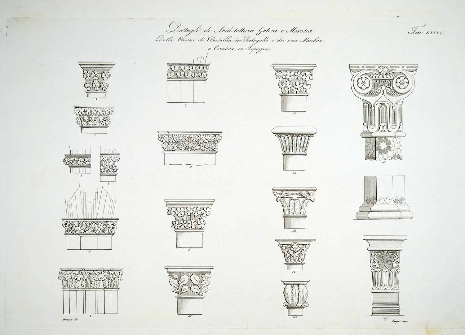 This is an original 1834 black and white copper engraving of some architectural details of the Monastery of Batalha in Portugal and the Mosque of Córdoba in Spain.