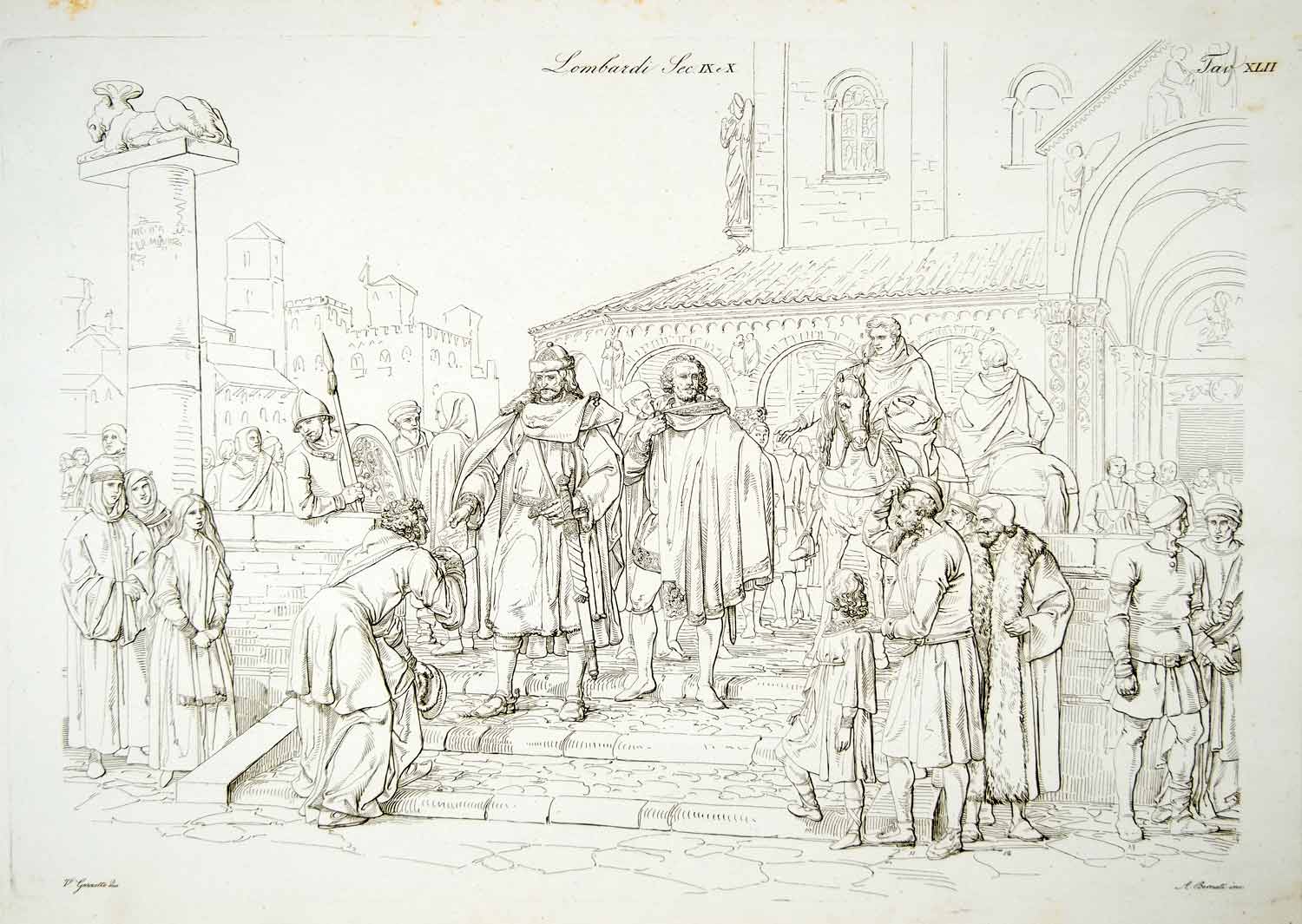 This is an original 1834 black and white copper engraving of the typical costume and dress of the Lombards or Langobards, circa the 9th and 10th century.