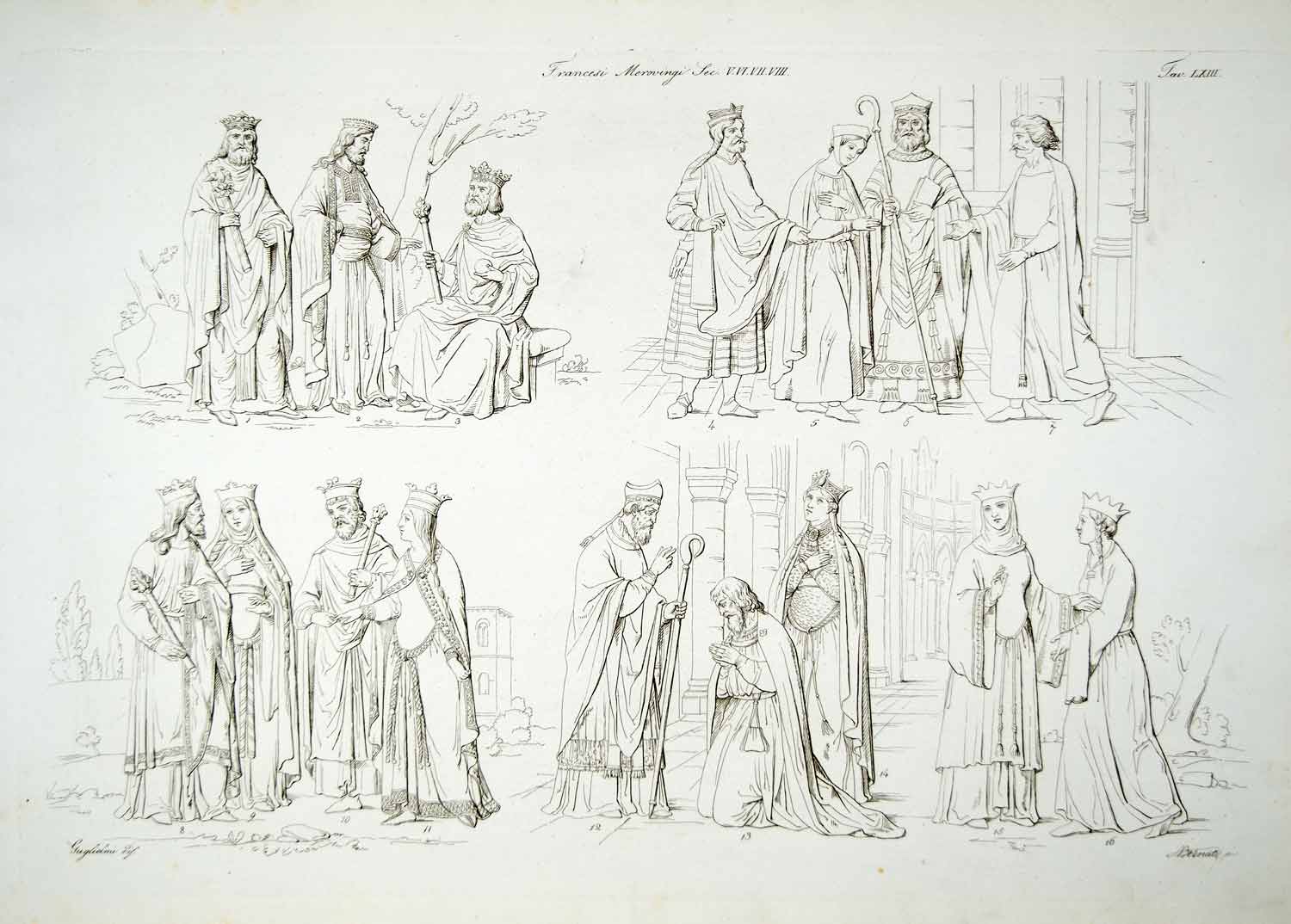 This is an original 1834 black and white copper engraving of the typical costume and dress worn by the nobles of the Merovingian dynasty, from the 5th - 8th century. Included are images of King Clovis and his second wife, Clotilde.