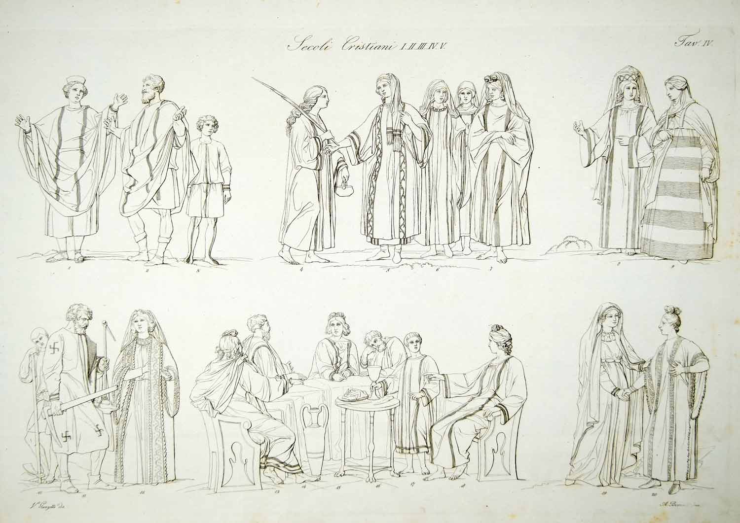 This is an original 1834 black and white copper engraving of the costume and typical dress of the early Christians, particularly the clothing worn by women.