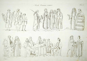 Period Paper is pleased to offer one of the most extraordinary collections of original, large format, museum-quality copper engravings depicting the history of costumes from around the world. In addition to the ancient and medieval costumes, these engravings include historical scenes of daily life, architectural drawings, transportation, and more. This group of copper engravings took 10 years to produce. Each engraving is intensely detailed and includes the original copperplate impression. These engravings are from the first and only edition of these works. And, within this group are some spectacular engravings with fine watercoloring by hand.