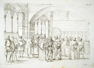 This is an original 1834 black and white copper engraving of the typical costume and dress worn by the judges, nobility, pages, and soldiers of Tuscany, circa the 14th - 15th century.