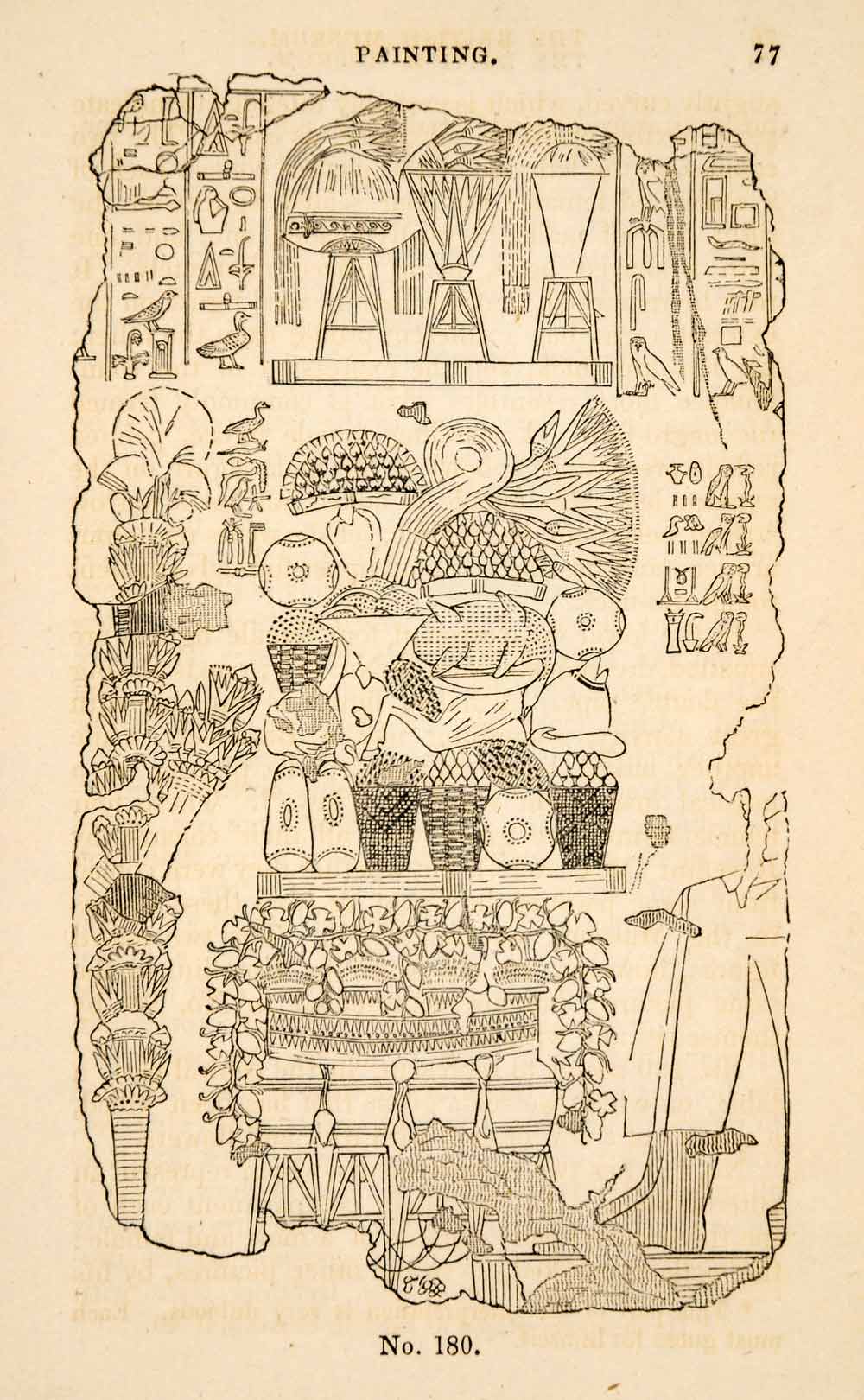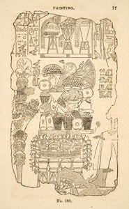 This is an original 1836 black and white in-text wood engraving of an Egyptian painting fragment from the British Museum depicting a table with a celebration feast upon it.