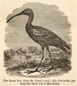 This is an original 1836 black and white in-text wood engraving of an Egyptian green Ibis amongst ancient ruins. The ibis was associated, in Egyptian mythology, with the afterlife. The ibis-headed go Thoth would be one of the gods who would judge the dead before allowing them to pass.
