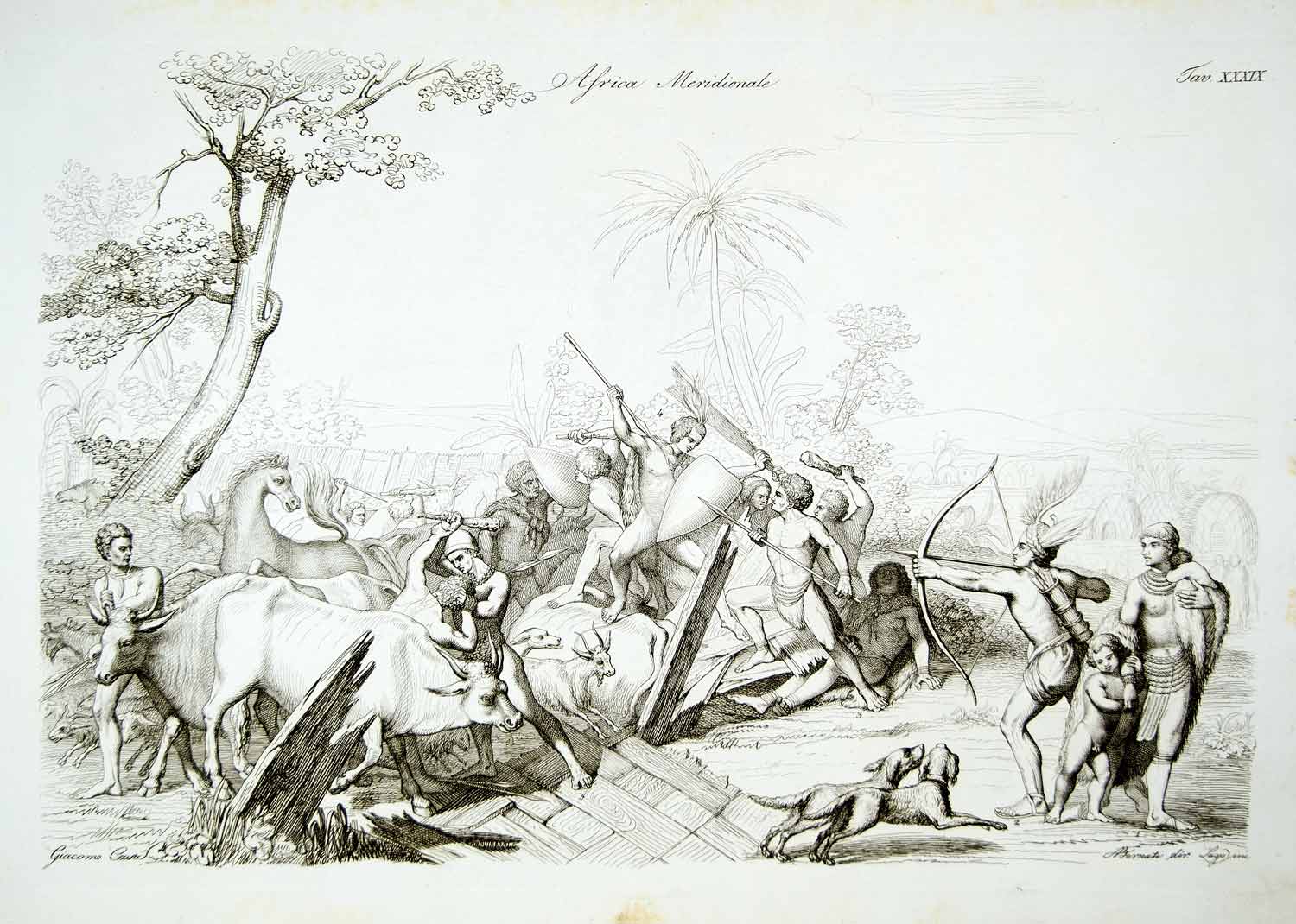 This is an original 1843 black and white copper engraving of an illustration by Giacomo Casa of Khoikhoi (or Hottentot), natives with their herds of Nguni cattle being beset by South African warriors.