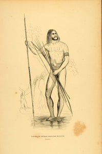 This is an original 1843 engraving of a hunter with his bow and arrows from Princess Marianne Strait, New Guinea.