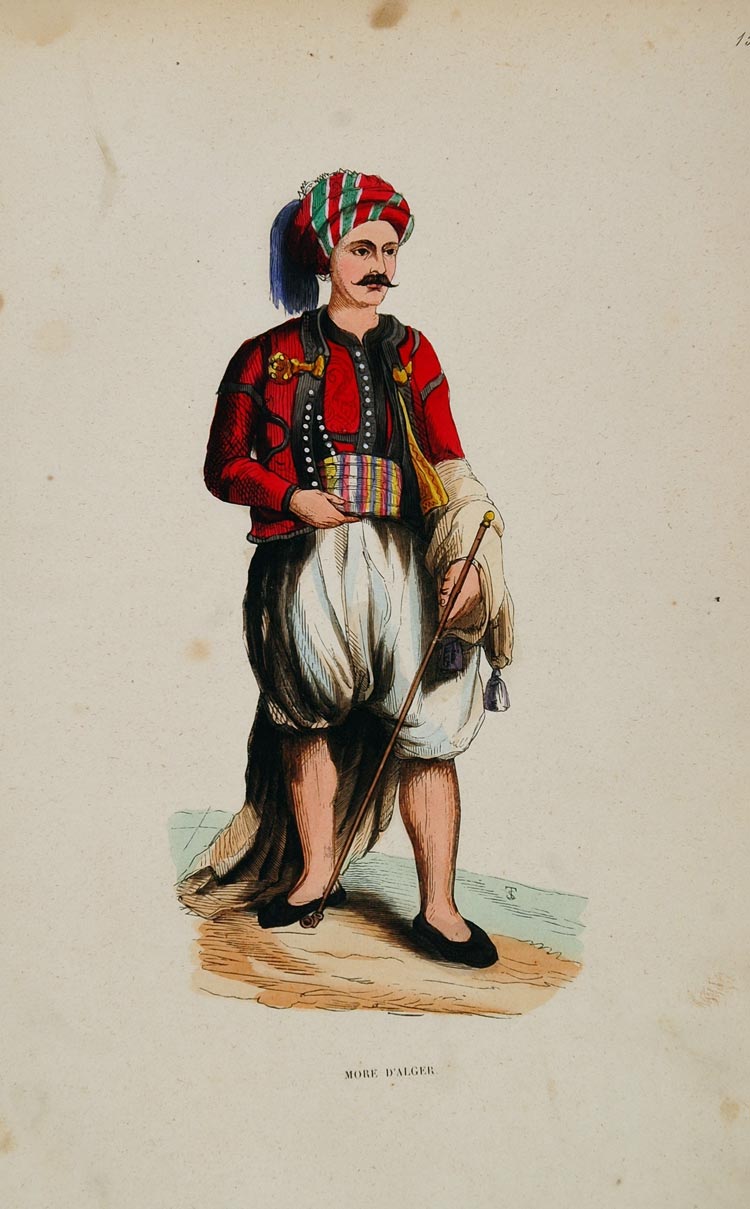 This is an original 1843 hand-colored woodblock print of a man from Algiers, Algeria.