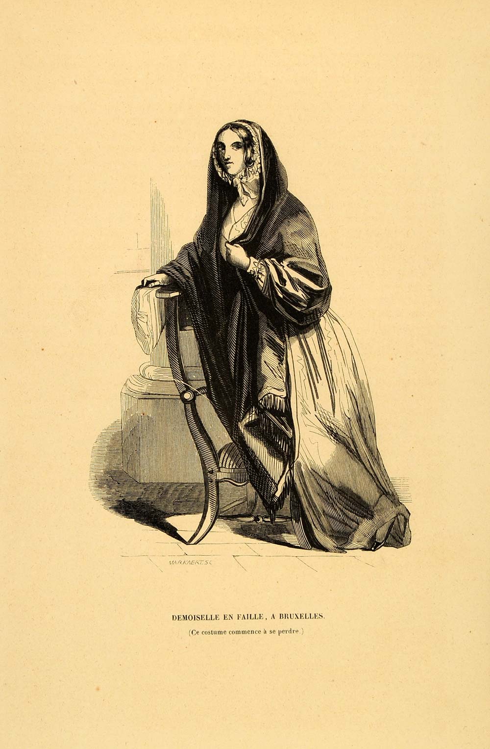 This is an original 1844 engraving of a young Belgian woman from Brussels, Belgium.