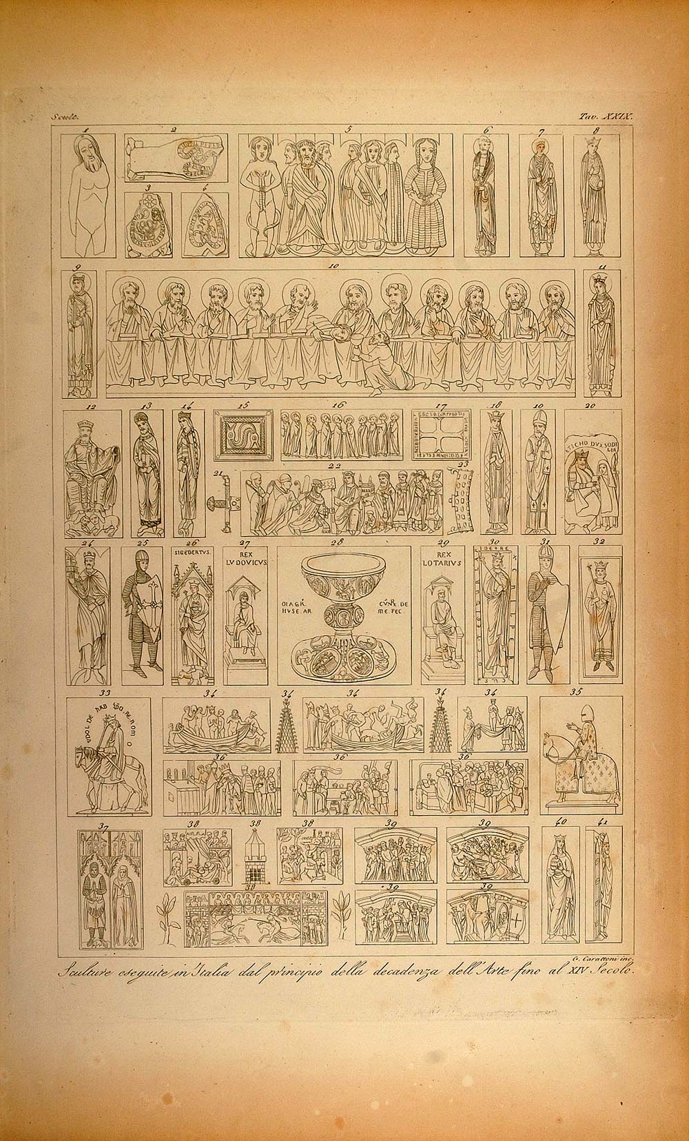 Period Paper is offering a rare and valuable collection of original copper engravings of Italian art and architecture from the 4th to the 16th century. This edition of the engravings collected and arranged by the French archaeologist and historian J. B. L. G. Seroux d'Agincourt (1730-1814), was published by Verlag von G. W. Mettenius in Frankfurt, Germany circa 1845. The captions are in Italian. The original copper plate imprint is visible on each engraving although this imprint does not show up well on the digital image. An end paper from this edition includes a stamp of the noted English architect --William White, 30A Wimpole St. W. with a date of April 15, 1864. Next to this stamp is the signature of F. Gilbert White and a date of June 11, 1860. These original engravings are exceptionally well preserved considering their age and are excellent items for framing. Any foxing appears darker on the digital image than it is on the actual item.
