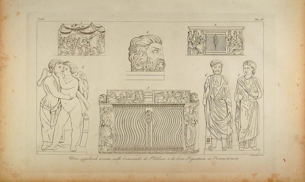 This is an original, circa 1845, copper engraving of 4th century burial urns found in the Catacomb of St. Urban and the Pignattara Tower in Rome.