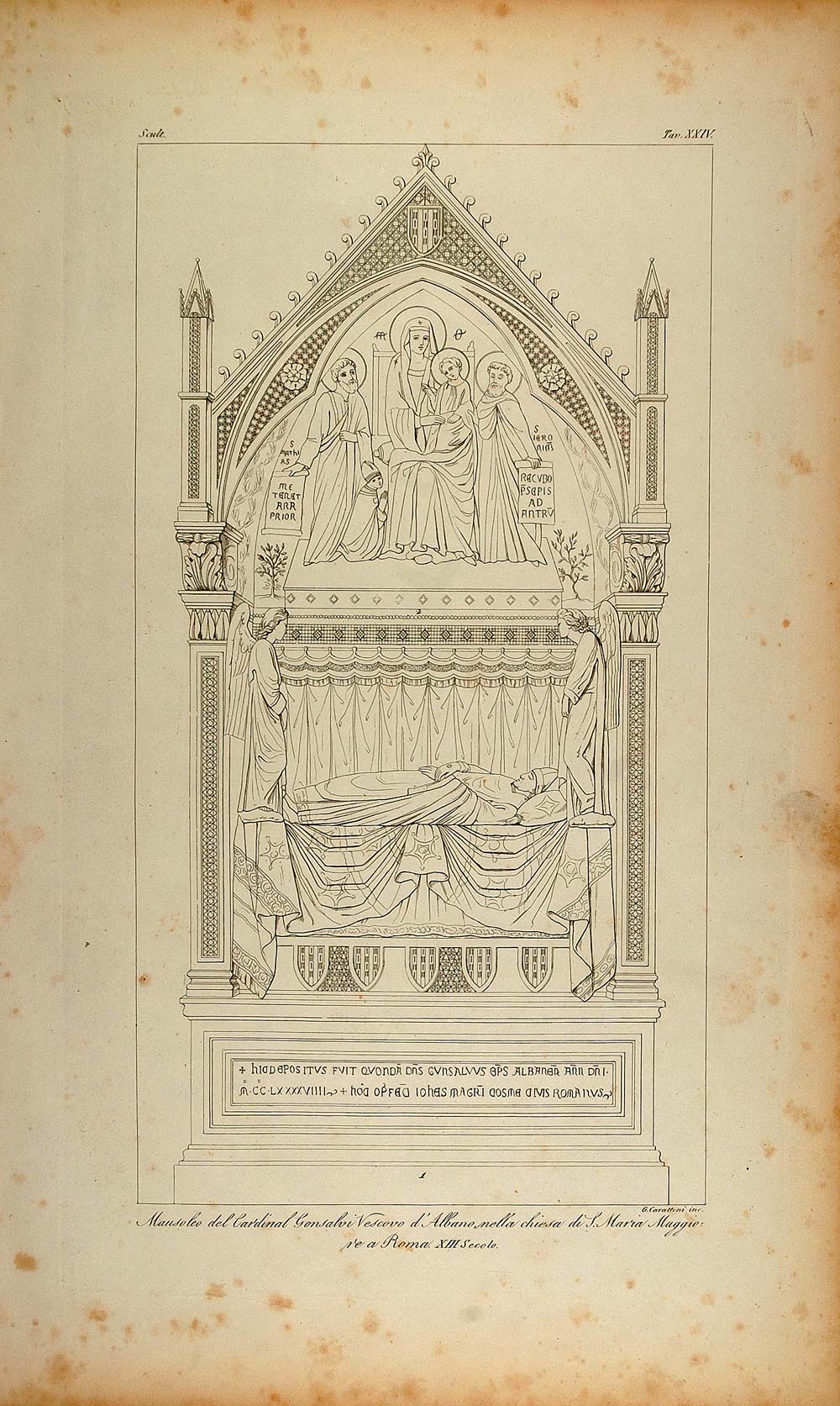 This is an original, circa 1845, copper engraving of the tomb of Cardinal Gonsalvi Vescovo in the Basilica di Santa Maria Maggiore in Rome.