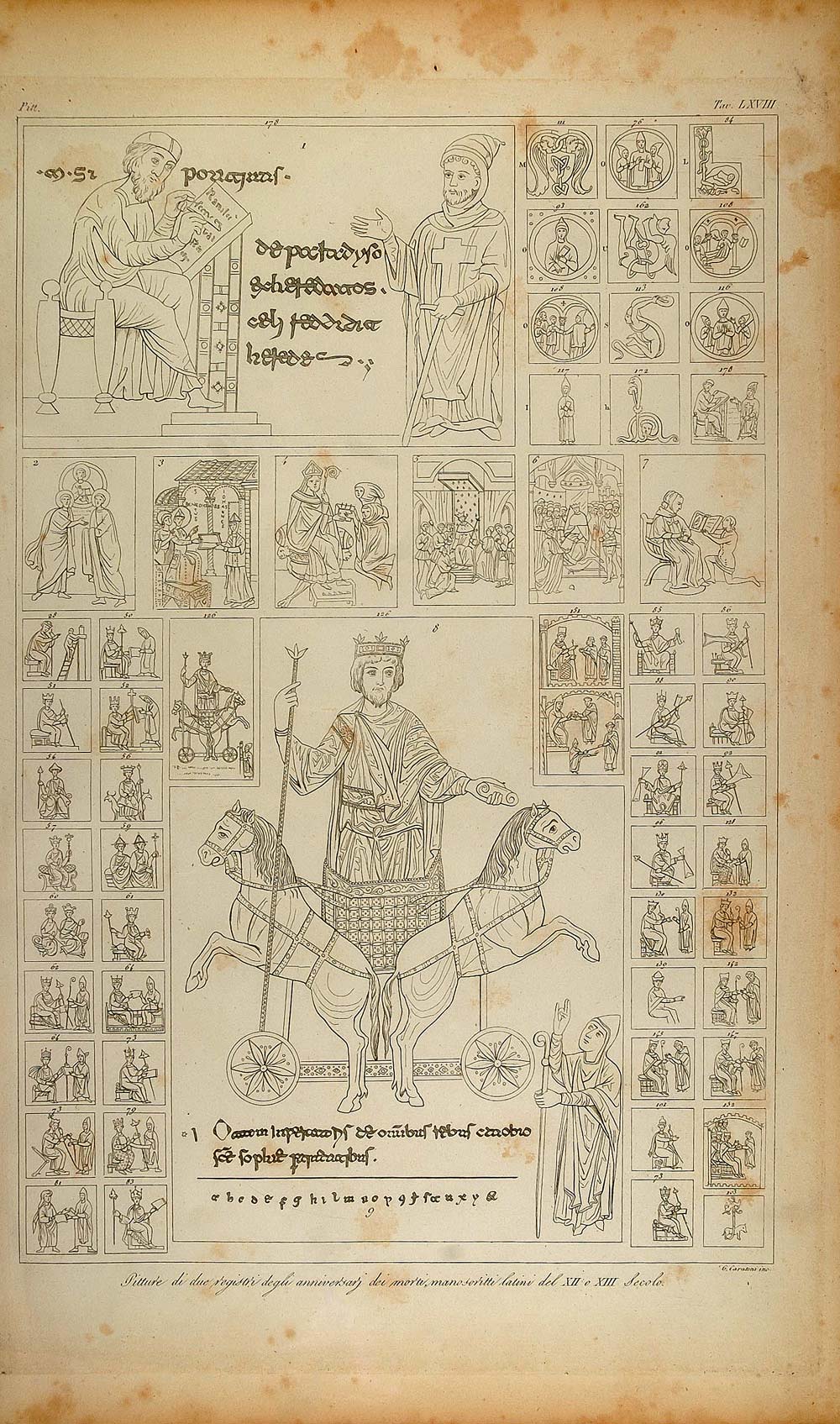 This is an original, circa 1845, copper engraving of medieval images from 12th or 13th century Latin manuscripts. Note the lowercase alphabet in the bottom of the engraving.