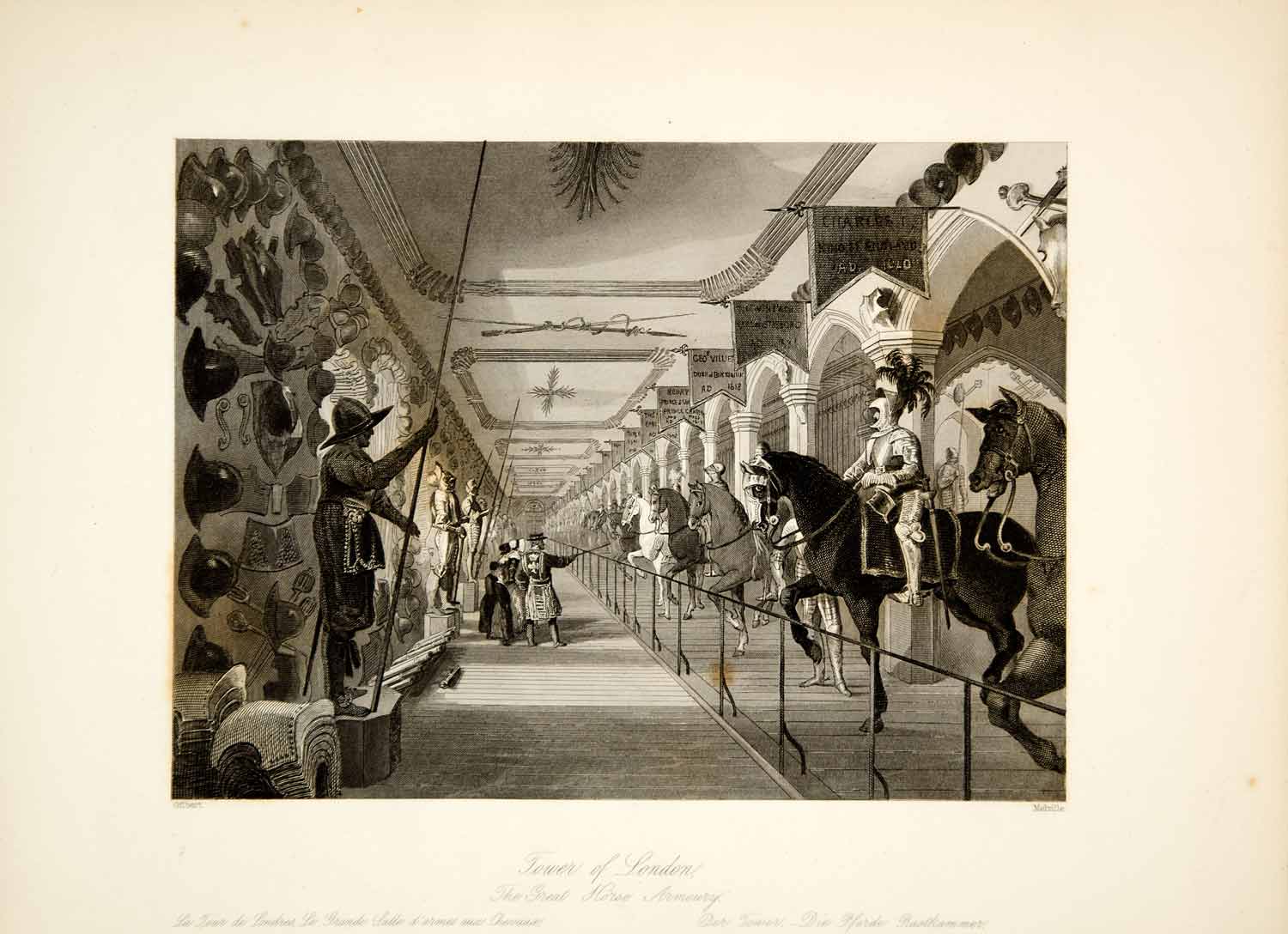 1845 Steel Engraving J Gilbert Tower of London Great Horse Armory England XGHD9