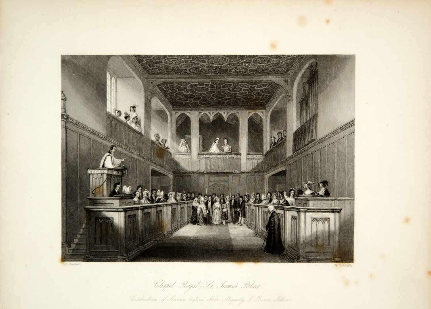 This is an original 1845 black and white steel engraving of a painting by Thomas Hosmer Shepherd that portrayed Queen Victoria and Prince Albert attending a church service at the Chapel Royal inside St. James's Palace in London, England.