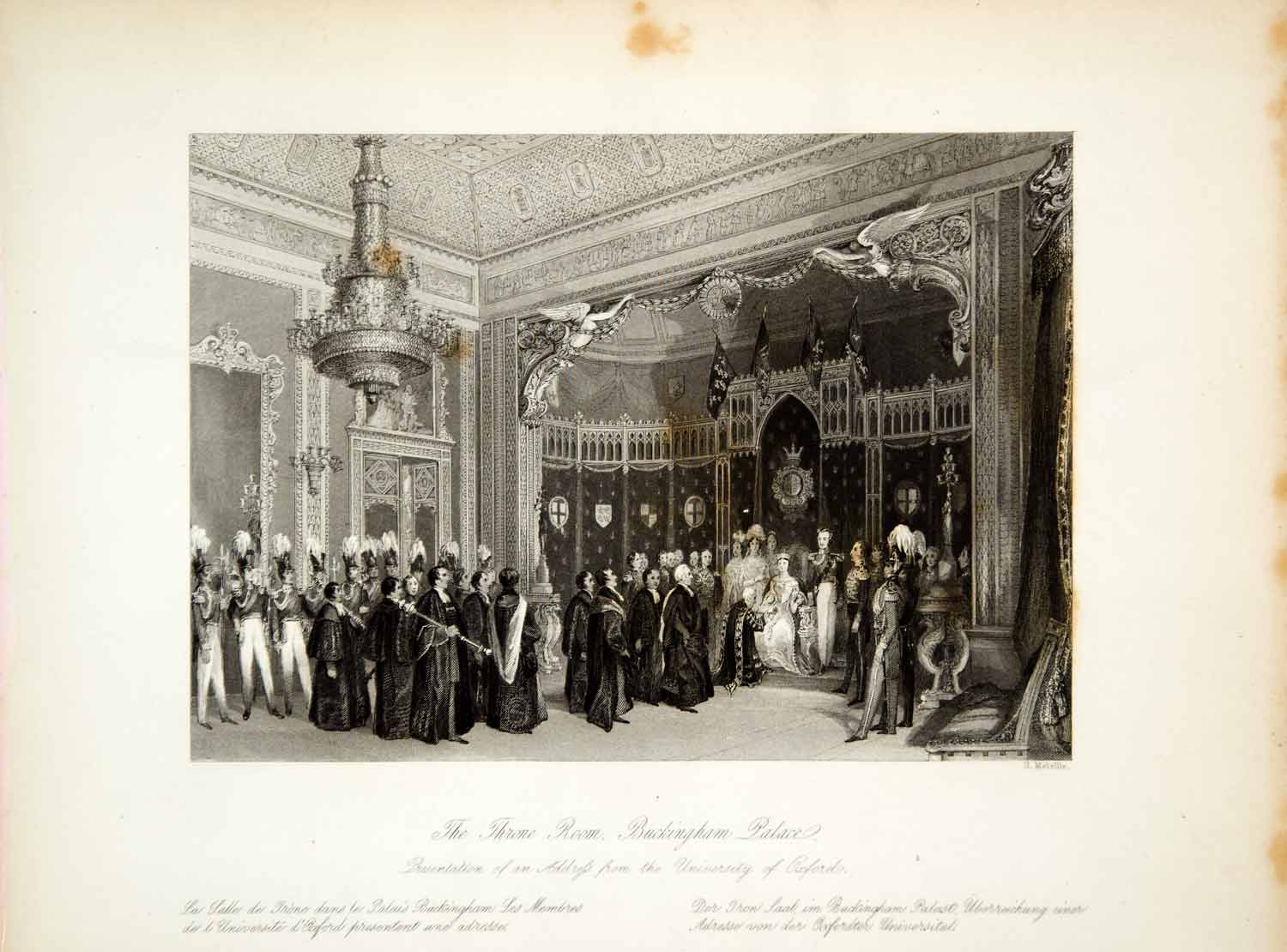 This is an original 1845 black and white steel engraving of a painting by Thomas Hosmer Shepherd that portrayed Queen Victoria of England being presented with an "addrefs" from the University of Oxford in the royal throne room at Buckingham Palace in London.