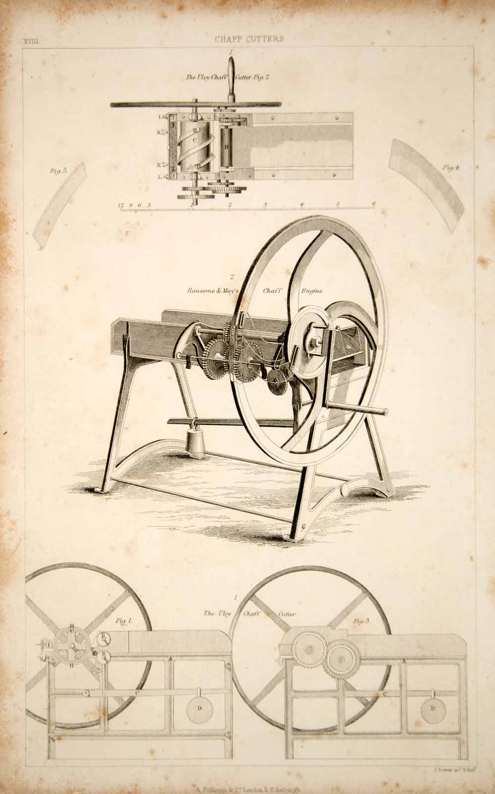 This is an original 1852 black and white steel engraving of two chaff cutters: the Uley chaff cutter and the Ransome & May's chaff cutter.