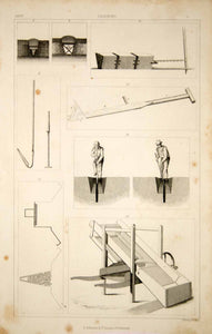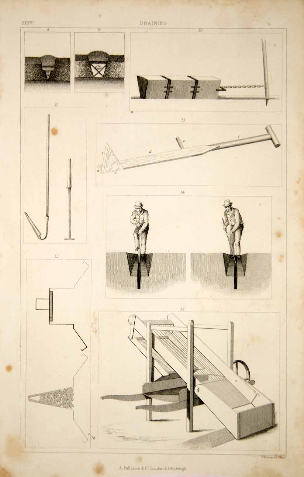 This is an original 1852 black and white steel engraving of various tools used for draining land.