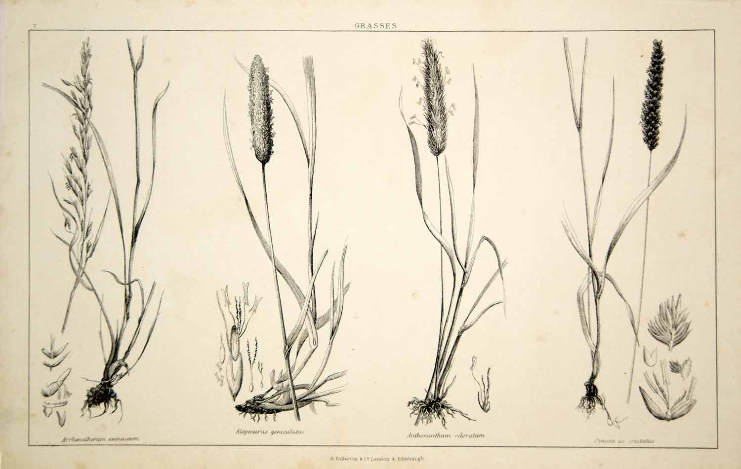 This is an original 1852 black and white steel engraving of various agricultural grasses.