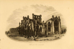 This is an original 1852 black and white steel engraving of the Melrose Abbey. Built in 1136 at the request of King David I of Scotland, this Gothic structure built in the form of St. John's Cross still stands in Melrose, Scotland despite being disestablished in 1609.