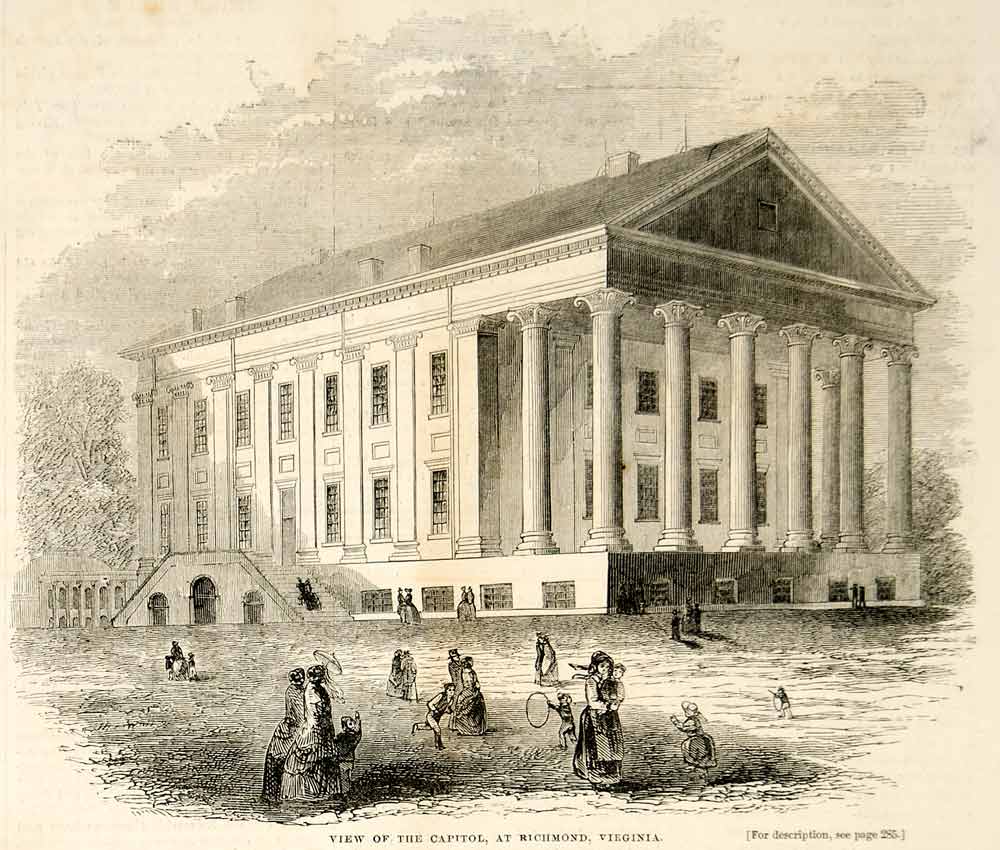 This is an original 1852 black and white in-text wood engraving of an illustration that portrays the Early Republic and Palladian style architecture of the Virginia State Capitol building in the city of Richmond, VA, USA.
