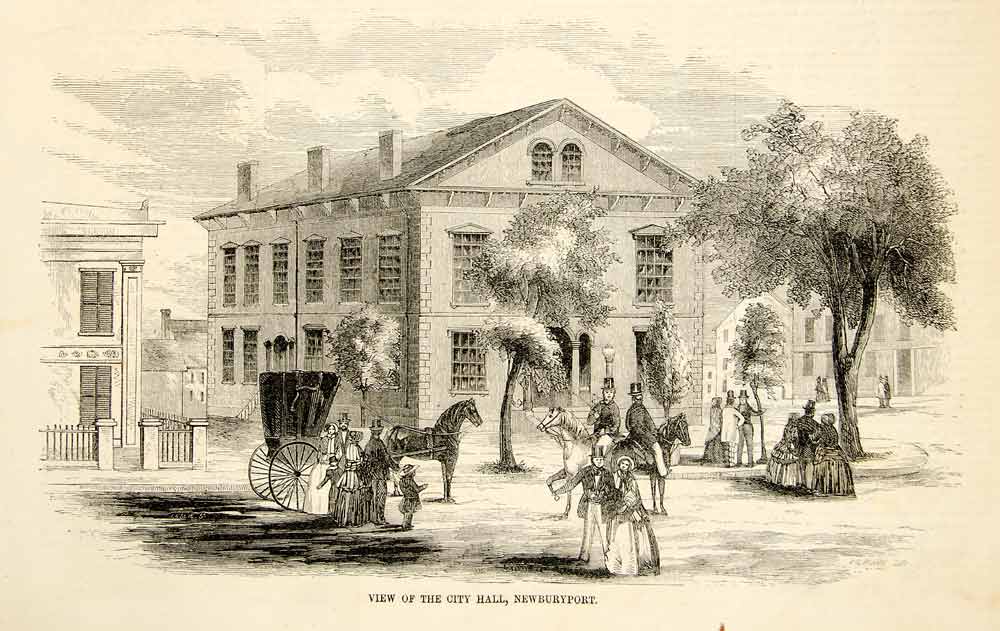 This is an original 1852 black and white in-text wood engraving of the city hall building at Newburyport, Massachusetts.