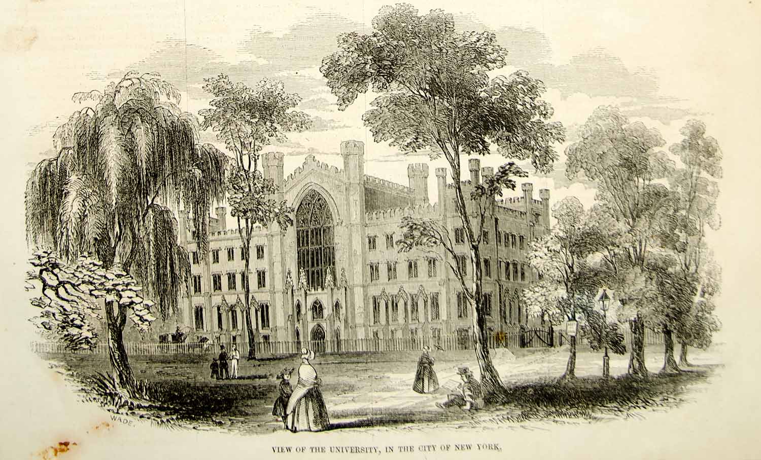This is an original 1852 black and white in-text wood engraving of a historic view of the Gothic architecture of a building on the campus of New York University during the mid 19th century.
