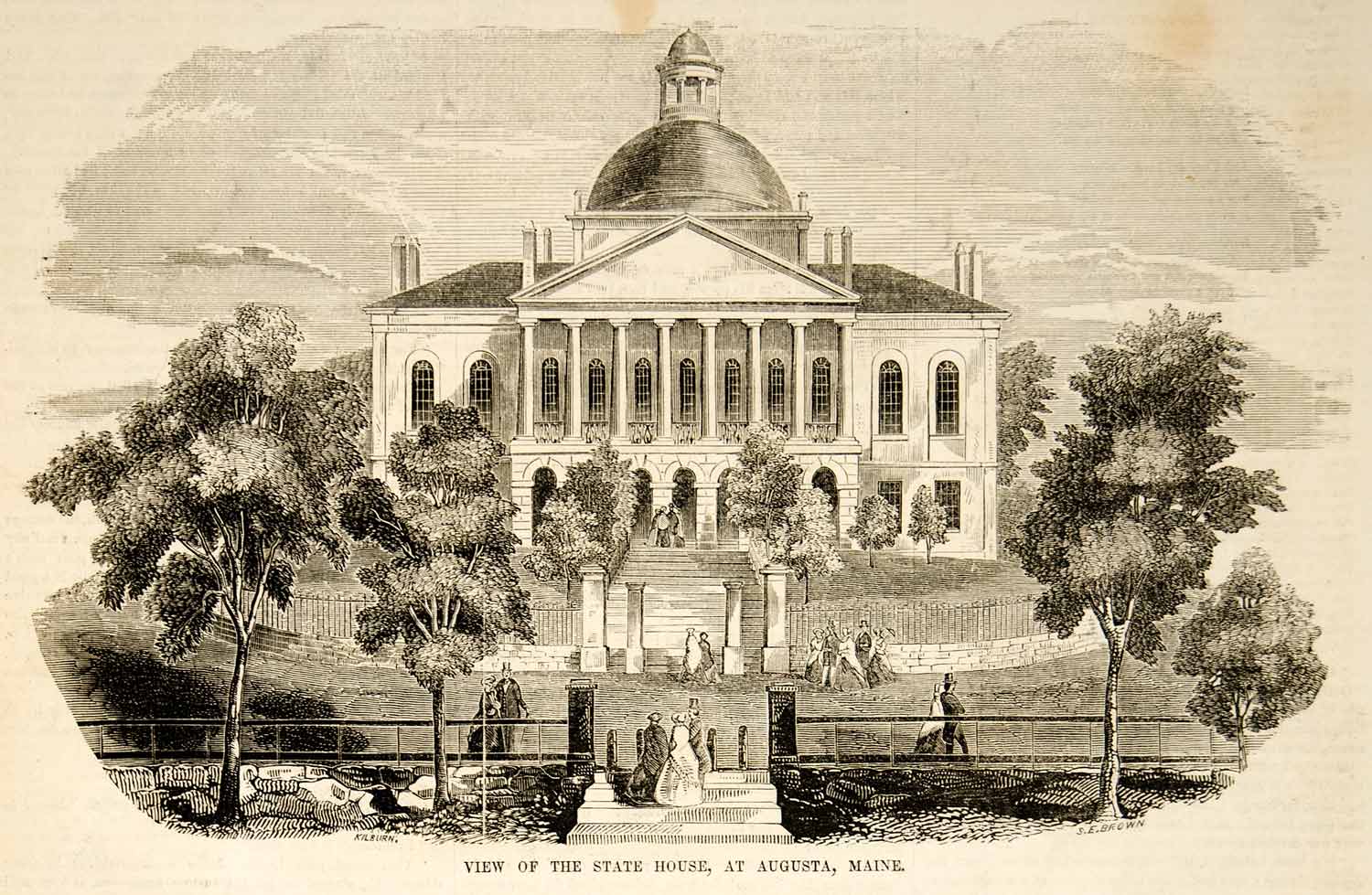 This is an original 1853 black and white in-text wood engraving of the Maine State House at Augusta, Maine. Designed by architect, Charles Bulfinch, it was built from 1829-1832 and is on the U.S. National Register of Historic Places.