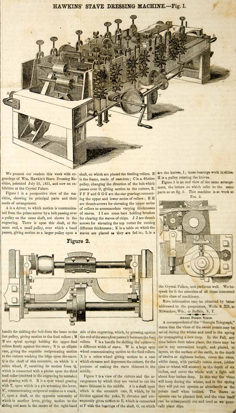 1853 Wood Engraving William Hawkin Stave Dressing Machine Antique Machinery YSA2