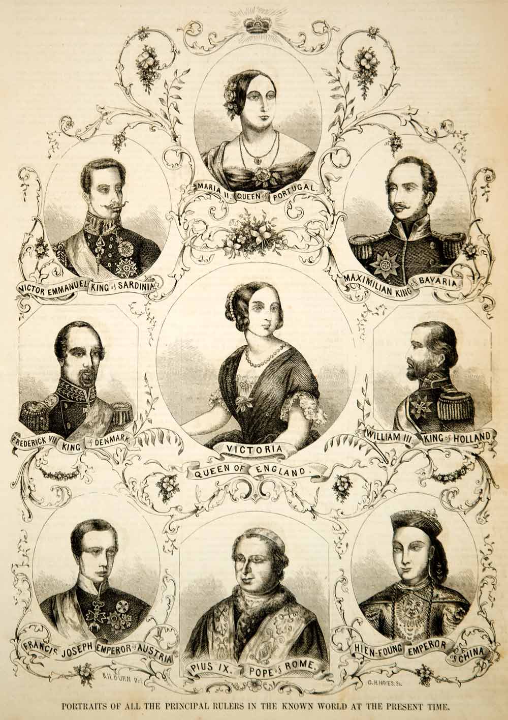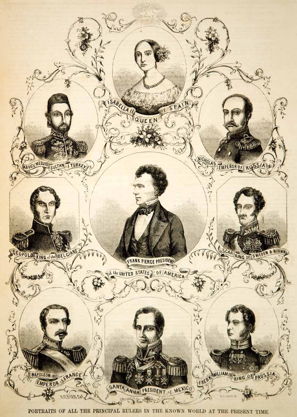 This is an original set of two 1854 black and white in-text wood engravings with portraits of the world rulers of the mid-19th century: President Franklin Pierce (USA); Isabella II, Queen of Spain; Nicholas, Emperor of Russia; Oscar, King of Sweden and Norway; Frederick William IV, King of Prussia; Santa Anna, President of Mexico; Napoleon III of France; Leopold, King of the Belgians; Abdul Medjid, Sultan of Turkey; Victoria, Queen of England; Maria II of Portugal; Maximilian, King of Bavaria; William III of Holland; Xianfeng, Emperor of China; Pius IX, Pope of Rome; Franz Joseph I of Austria; Frederick VII, King of Denmark; and Victor Emmanuel, King of Sardinia. Please see both images.