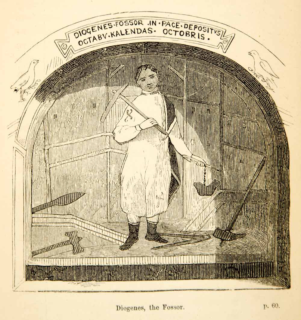 This is an original 1854 monochrome wood engraving of a Roman fossor named Diogenes that helped dig the tunnels for the catacombs beneath Rome, Italy.