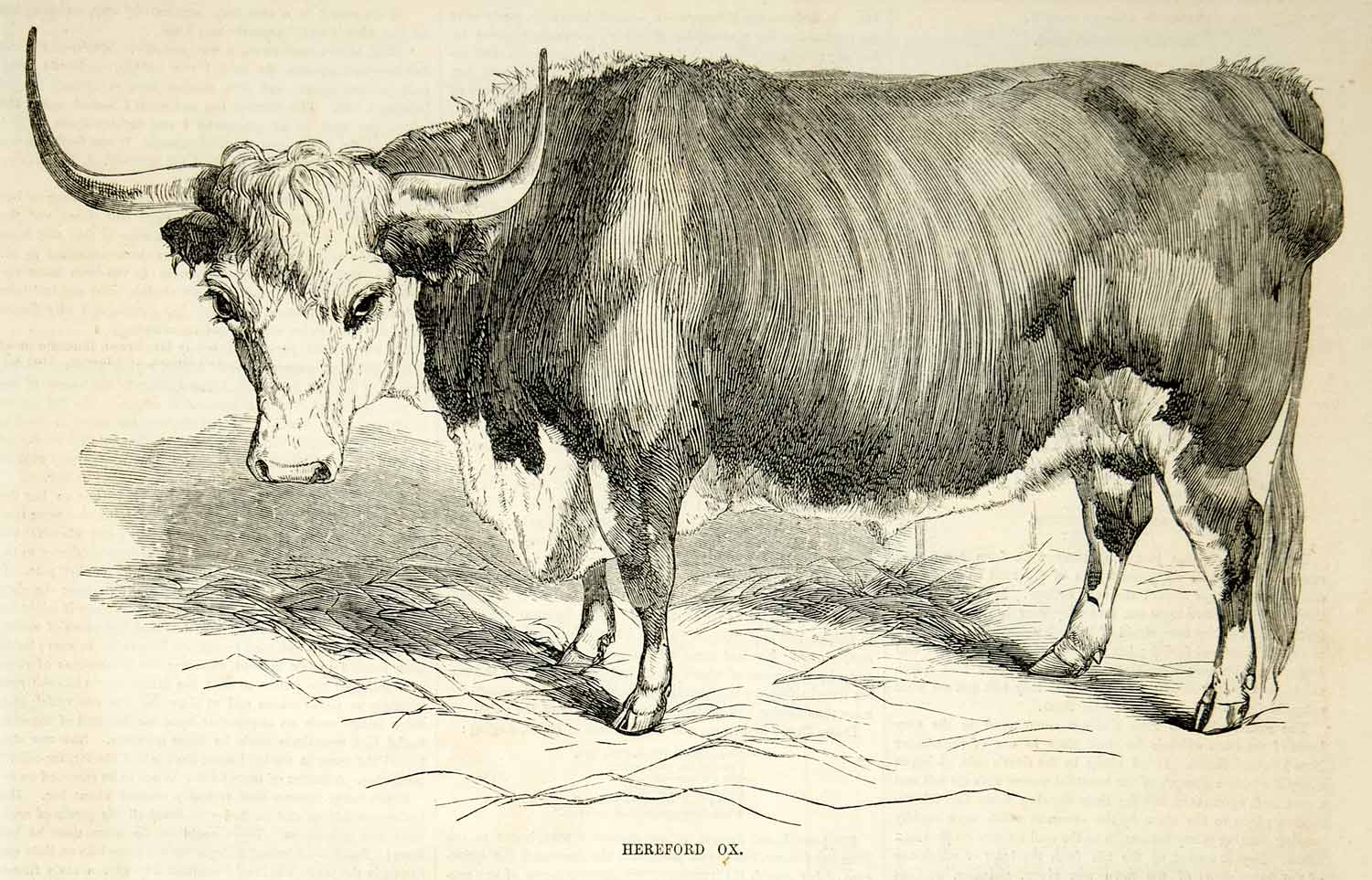 This is an original 1854 black and white in-text wood engraving of a horned Hereford ox.