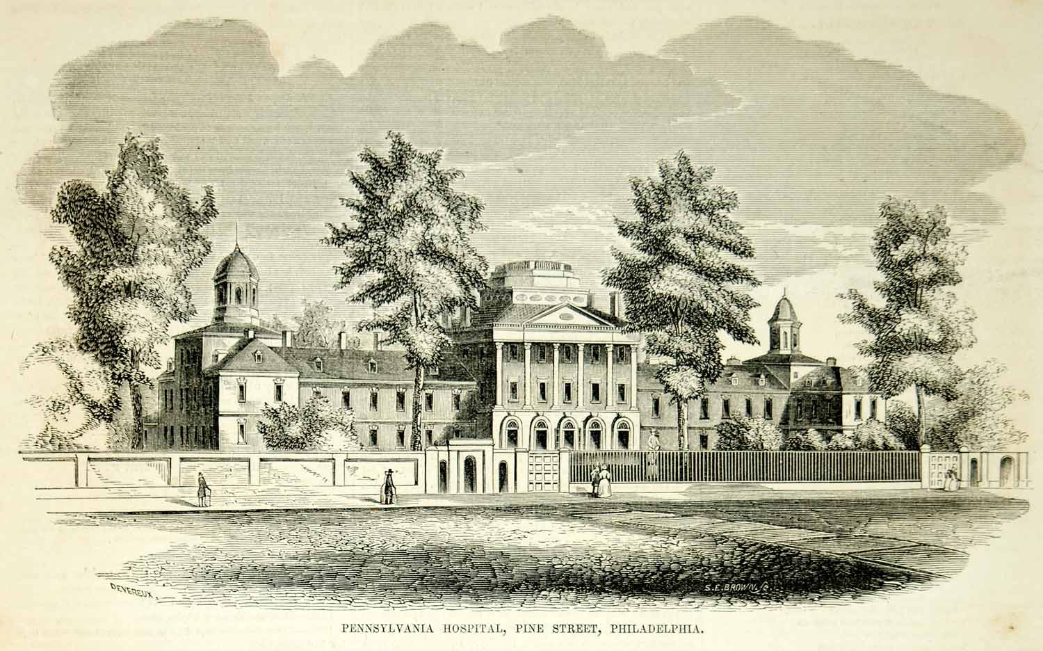 This is an original 1854 black and white in-text wood engraving of Pennsylvania Hospital on Pine Street in Philadelphia. Built in 1756, it is the oldest hospital in the United States.