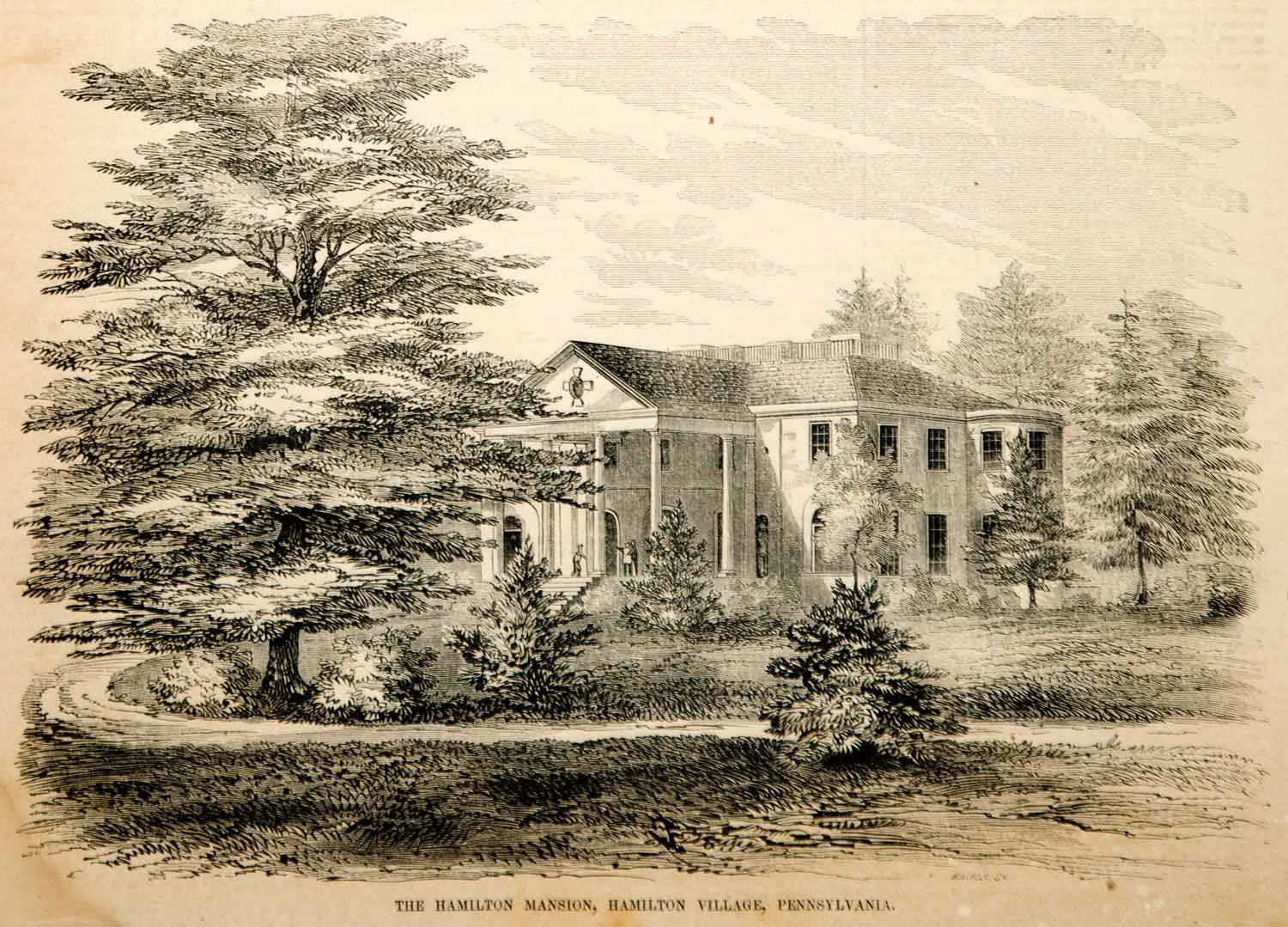 This is an original 1854 black and white in-text wood engraving of Woodlands, an historic house on the west bank of the Schuylkill River in Philadelphia. The house and adjoining lands became a cemetery in 1840.
