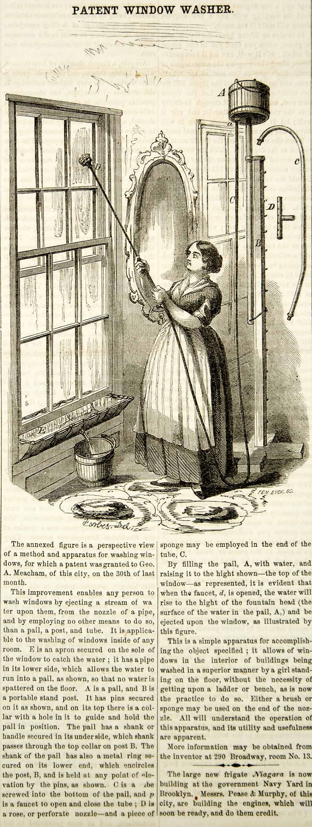 1855 Wood Engraving Antique Window Washer Washing Victorian Home Invention YSA2
