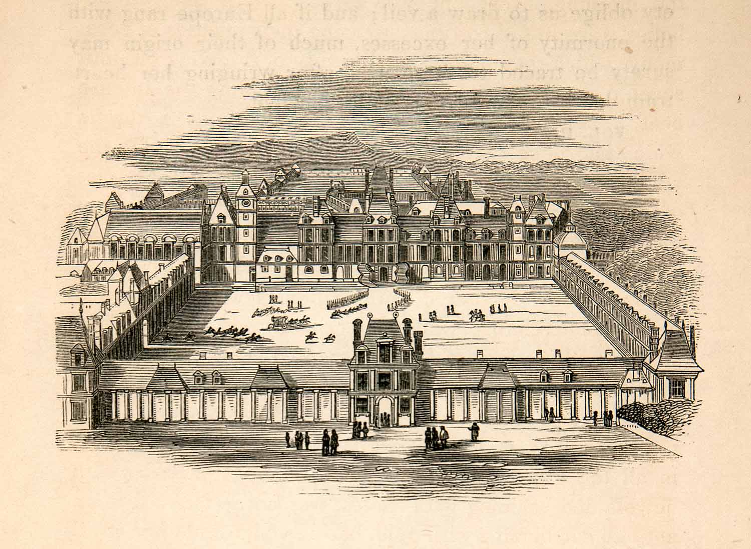 This is an original 1855 black and white in-text wood engraving of the Château de Fontainebleau, located in France. It is among the largest French castles, and it was here, in the Cour du Cheval Blanc, that Napoleon Bonaparte said his formal farewell to his Old Guard, veterans of his Imperial Guard, before his official abdication in 1814.