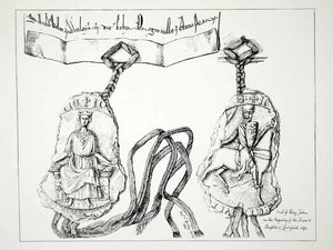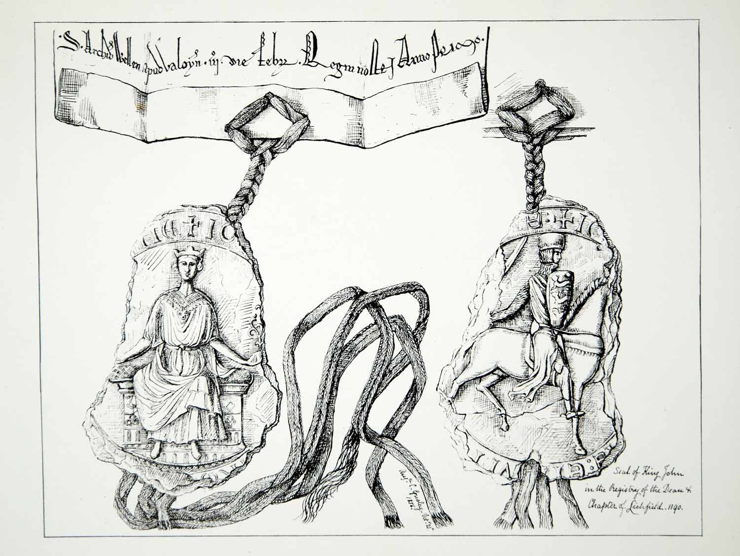 This is an original 1856 black and white lithograph of an illustration by the wife of Cuthbert Gresley of the Great Seal of the Realm during the reign of King John of England between 1199-1216 CE during the Middle Ages.