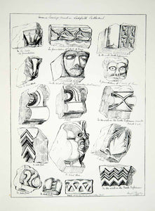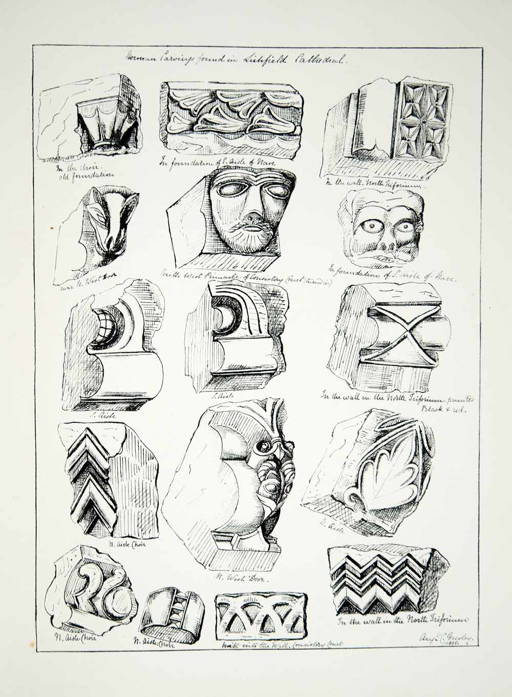 This is an original 1856 black and white lithograph of an illustration by the wife of Cuthbert Gresley of several Norman style stone carvings that were excavated from Lichfield Cathedral in Staffordshire, England.