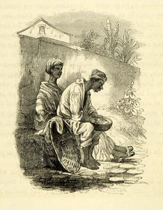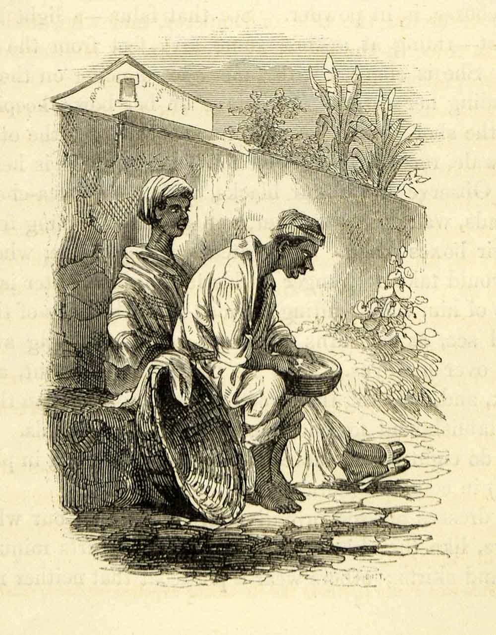 This is an original 1856 monochrome wood engraving of two men seated, one holding a marimba, a musical instrument in the percussion family.