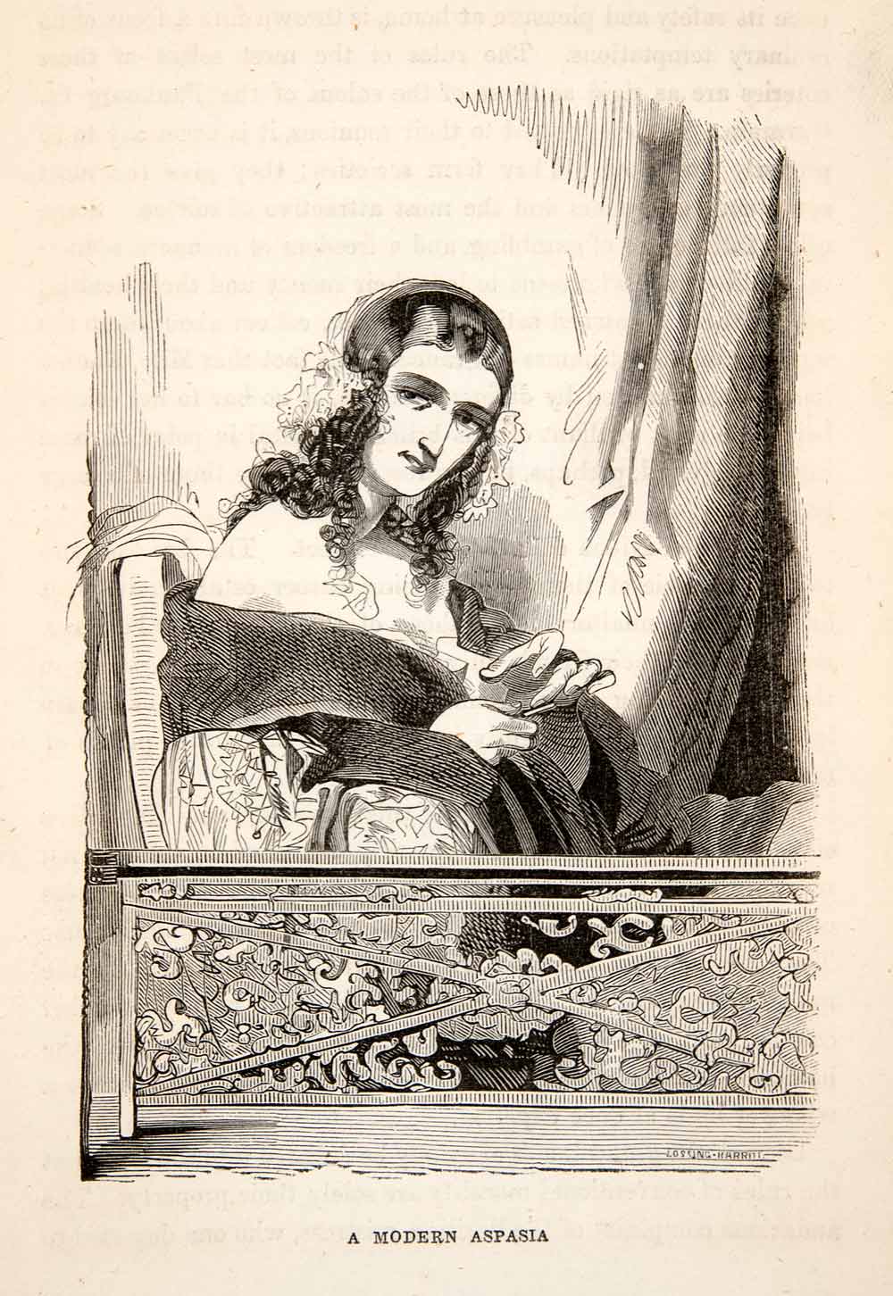 This is an original 1856 black and white wood engraving of a modern day "Aspasia." Aspasia was a Milesian woman who was involved with Pericles. She was also reported to be an owner of a brothel and a harlot.