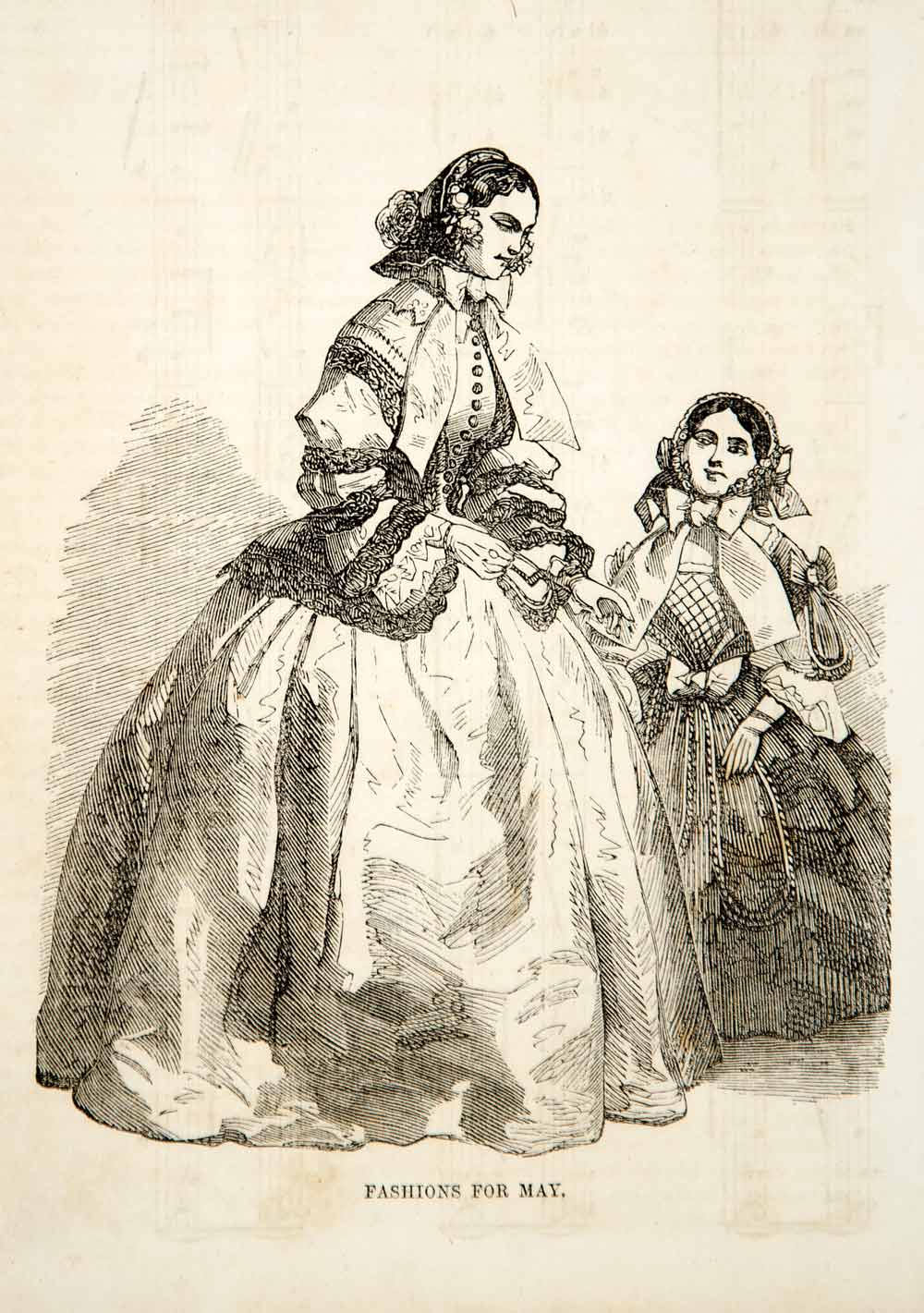 This is an original 1856 black and white in-text wood engraving of two Victorian ladies.