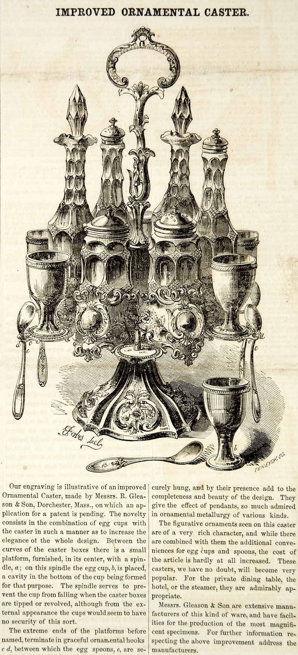1856 Wood Engraving Victorian Ornamental Caster Egg Cups Spoon Dining Table YSA2