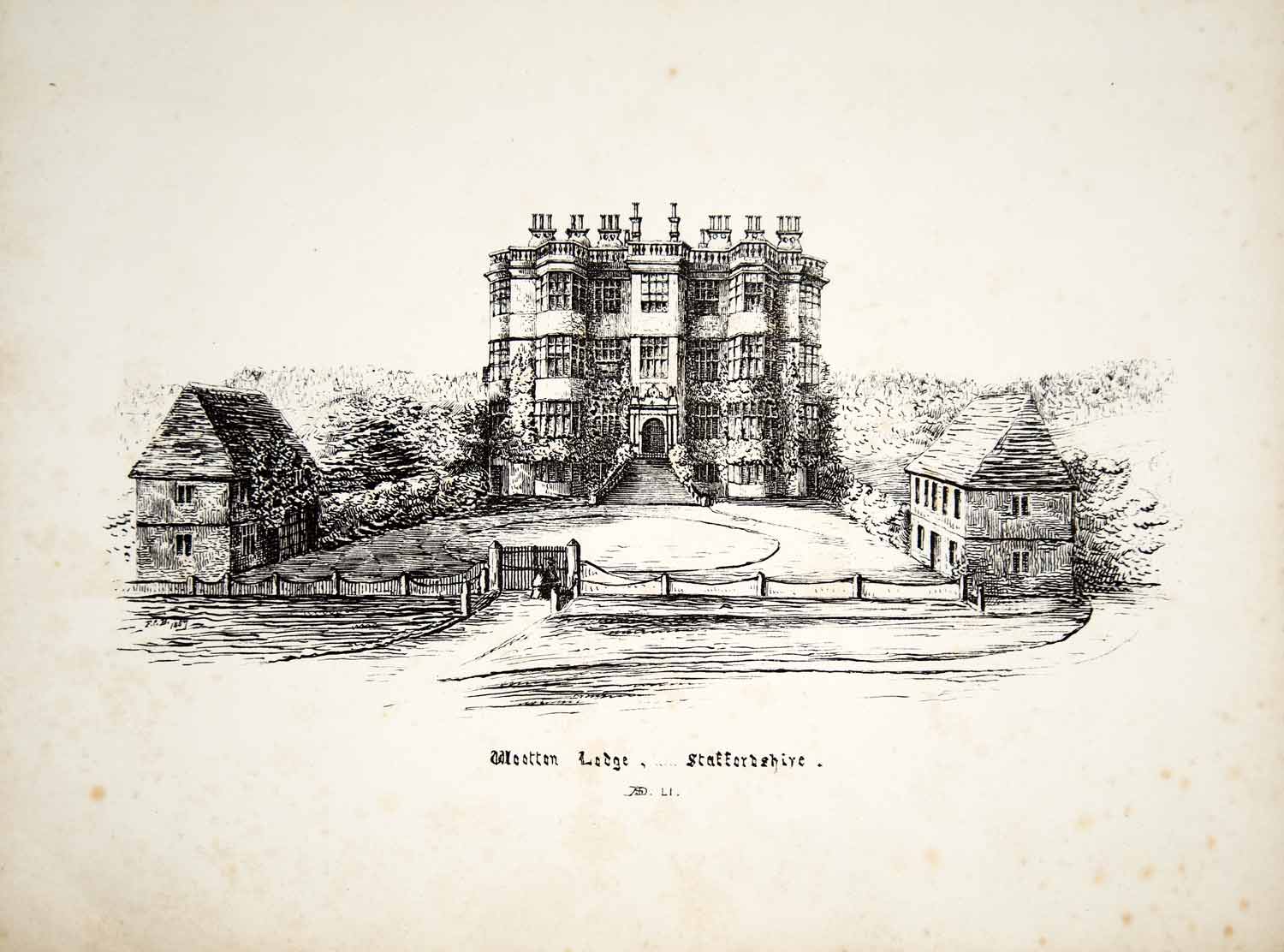 This is an original 1857 black and white lithograph of an illustration by F.C. Blagge of the 17th century country house known as Wootton Lodge that is located near Ellastone in Staffordshire, England, United Kingdom. The estate is a Grade I listed building and English Heritage site. The lodge was built in 1611 by Sir Richard Fleetfood and designed by architect Robert Smythson.